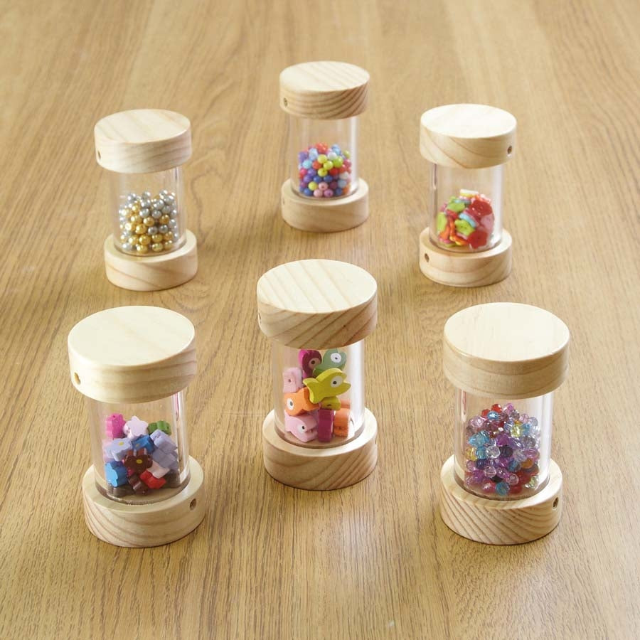 ΠεριγραφήΞύλινες κουδουνίστρες, ιδανικές για μικρά, αλλά και για μεγάλα παιδιά, για παιχνίδι και αισθητηριακή ανάπτυξη. Διαθέτουν ξύλινες άκριες και είναι διάφανες στο κέντρο, έτσι ώστε τα παιδιά να μπορούν να δουν το περιεχόμενό τους, το οποίο ποικίλει, από χάντρες και κουμπιά σε διάφορα σχήματα και χρώματα. Καθώς τα παιδιά κουνούν τις κουδουνίστρες μπορούν να ακούσουν τον ήχο που κάνουν, αλλά και να δουν τα περιεχόμενά τους να μετακινούνται. Μπορούν να χρησιμοποιηθούν για ελεύθερο παιχνίδι, αλλά και για συνοδεία σε τραγούδια και ποιηματάκια. |